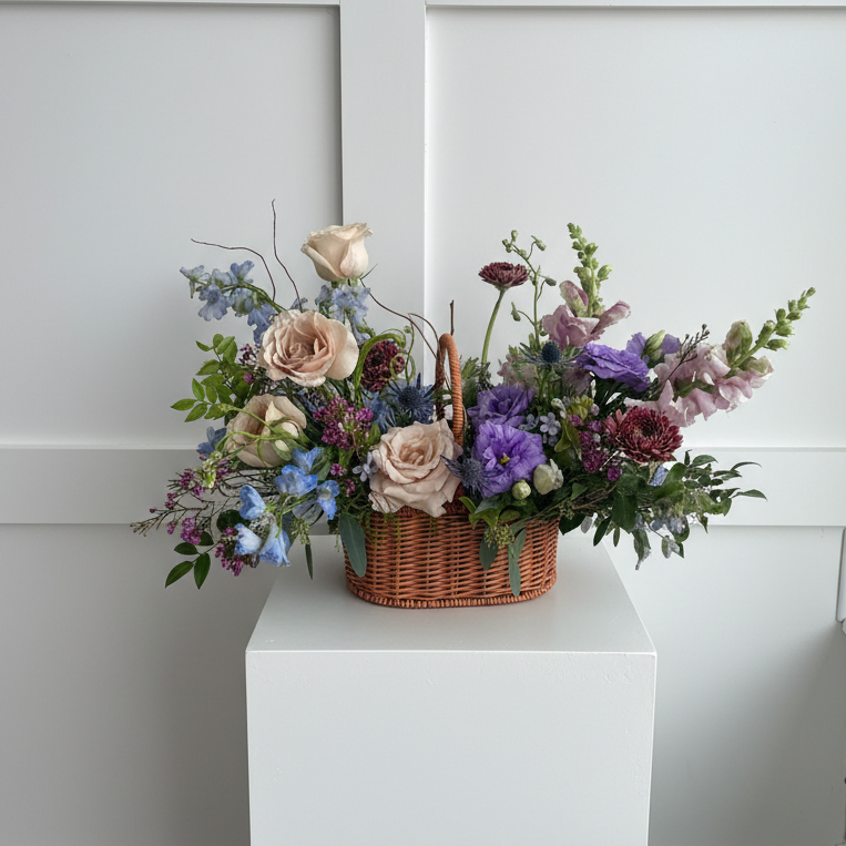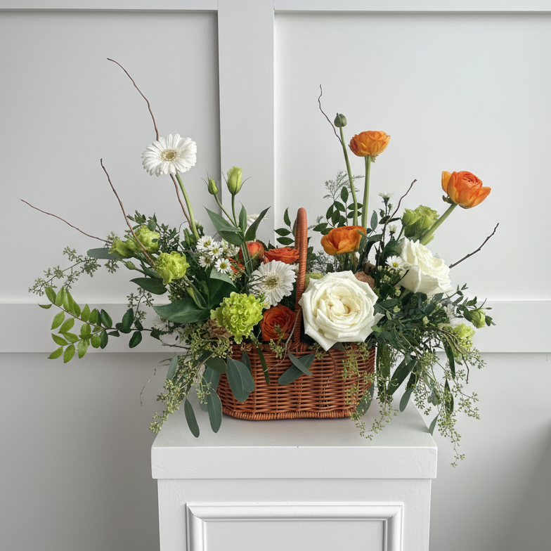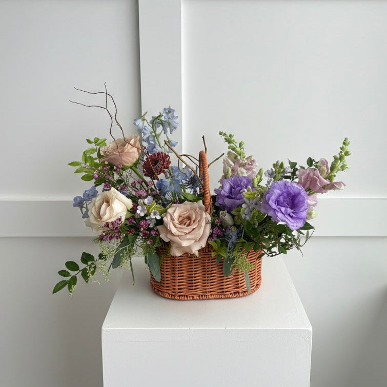 Spring Meadow is a seasonal floral arrangement designed in a charming handled basket and filled with fresh spring blooms and lush greenery. Light, airy, and garden-inspired, this arrangement captures the feeling of flowers gathered from a meadow in bloom.