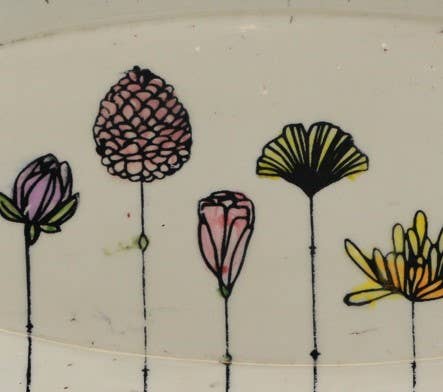 All of my hand made pottery is made from a rich, red earthenware clay, decorated with a white clay slip, and surface design that is screen printed. Each dish is Hand built from slabs or Wheel Thrown, hand printed and slipped, and as such, is subject to slight variation in dimensions and proportions.