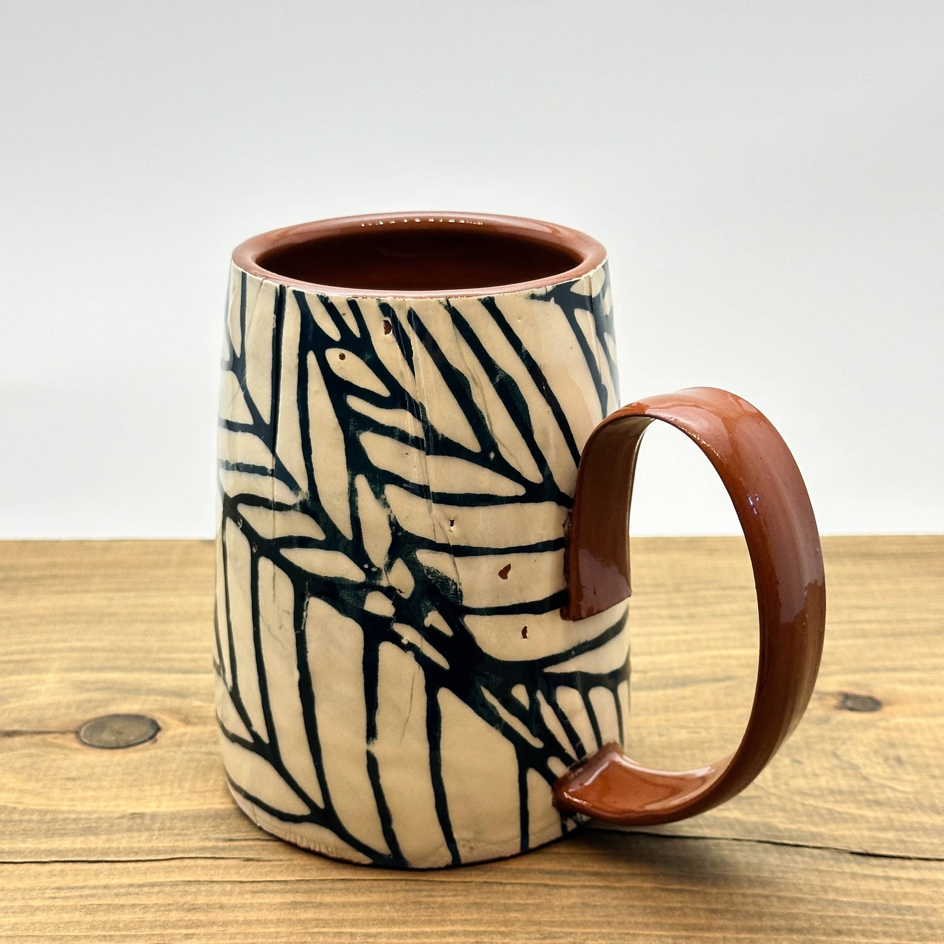 This tall vessel is ideal for a beer, tall cup of warm cider, or a generous sip of tea. All of my hand made pottery is made from a rich, red earthenware clay, decorated with a white clay slip, and surface design that is both hand painted and screen printed. The handle is balanced thoughtfully so that the mug can be held in the hands for warmth or held away from the hand as your warm beverage is cooling.