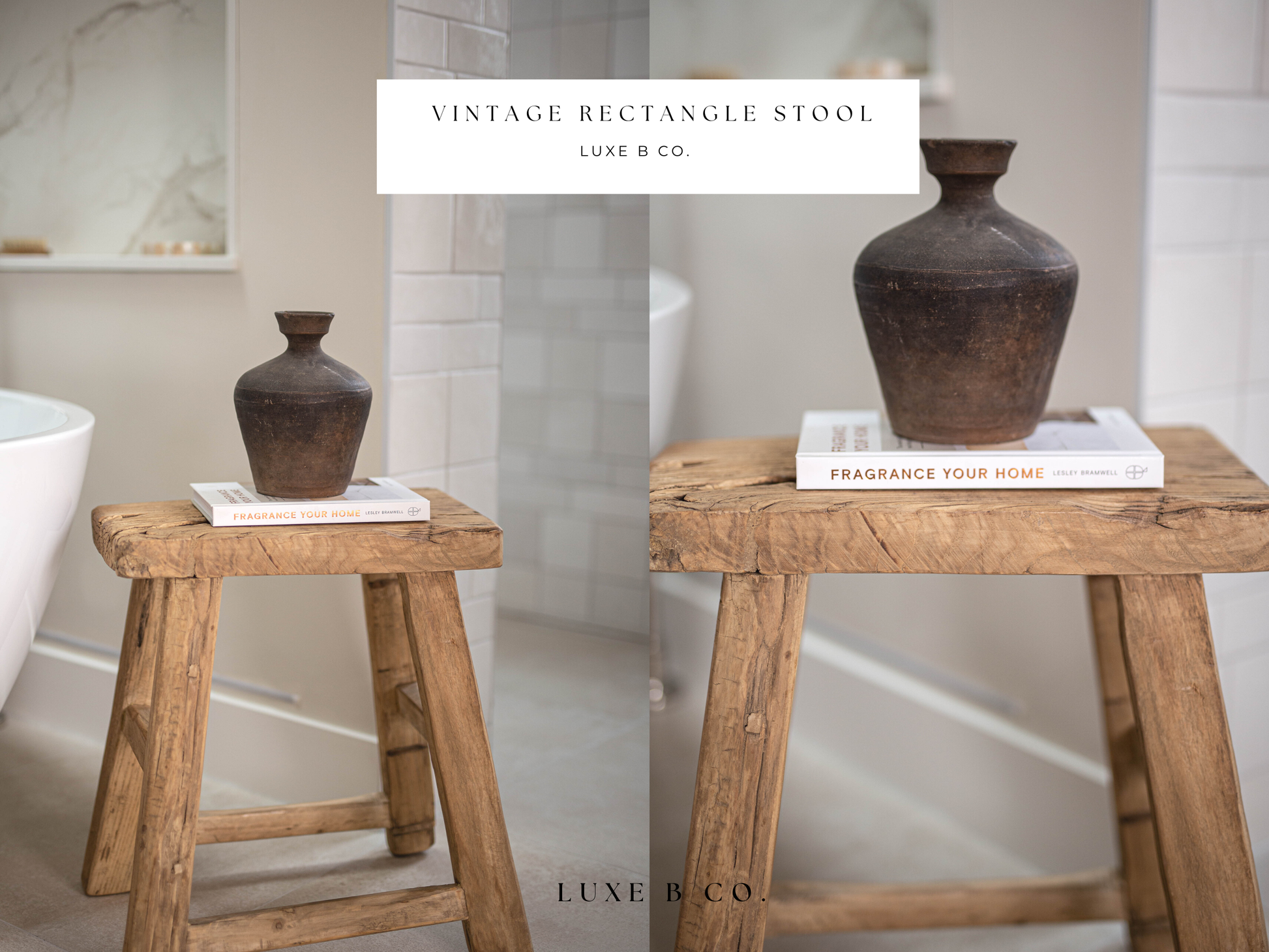 This vintage square elm wood stool is handmade from reclaimed antique elm wood and is then finished with a natural coating of beeswax.